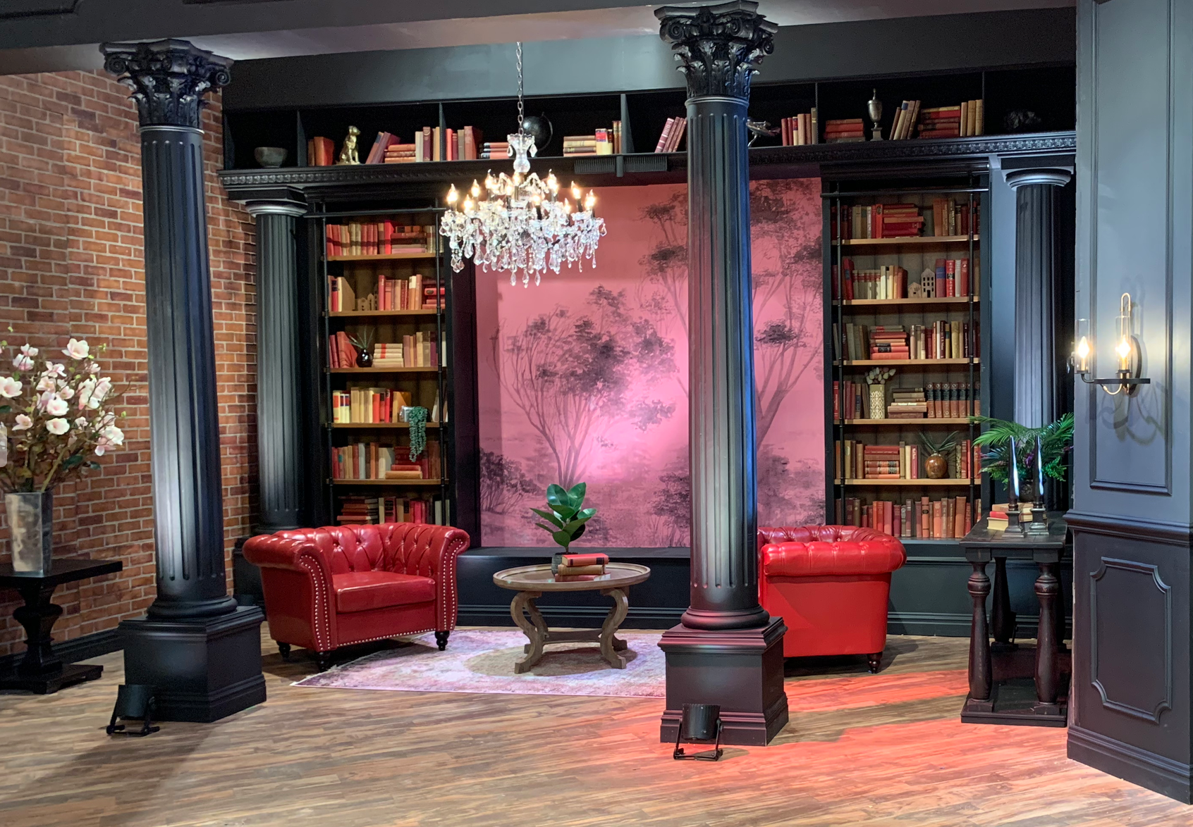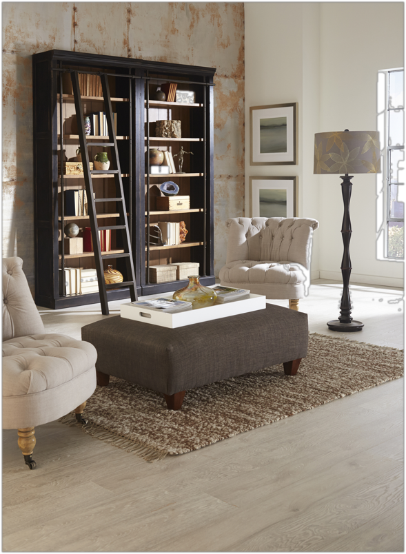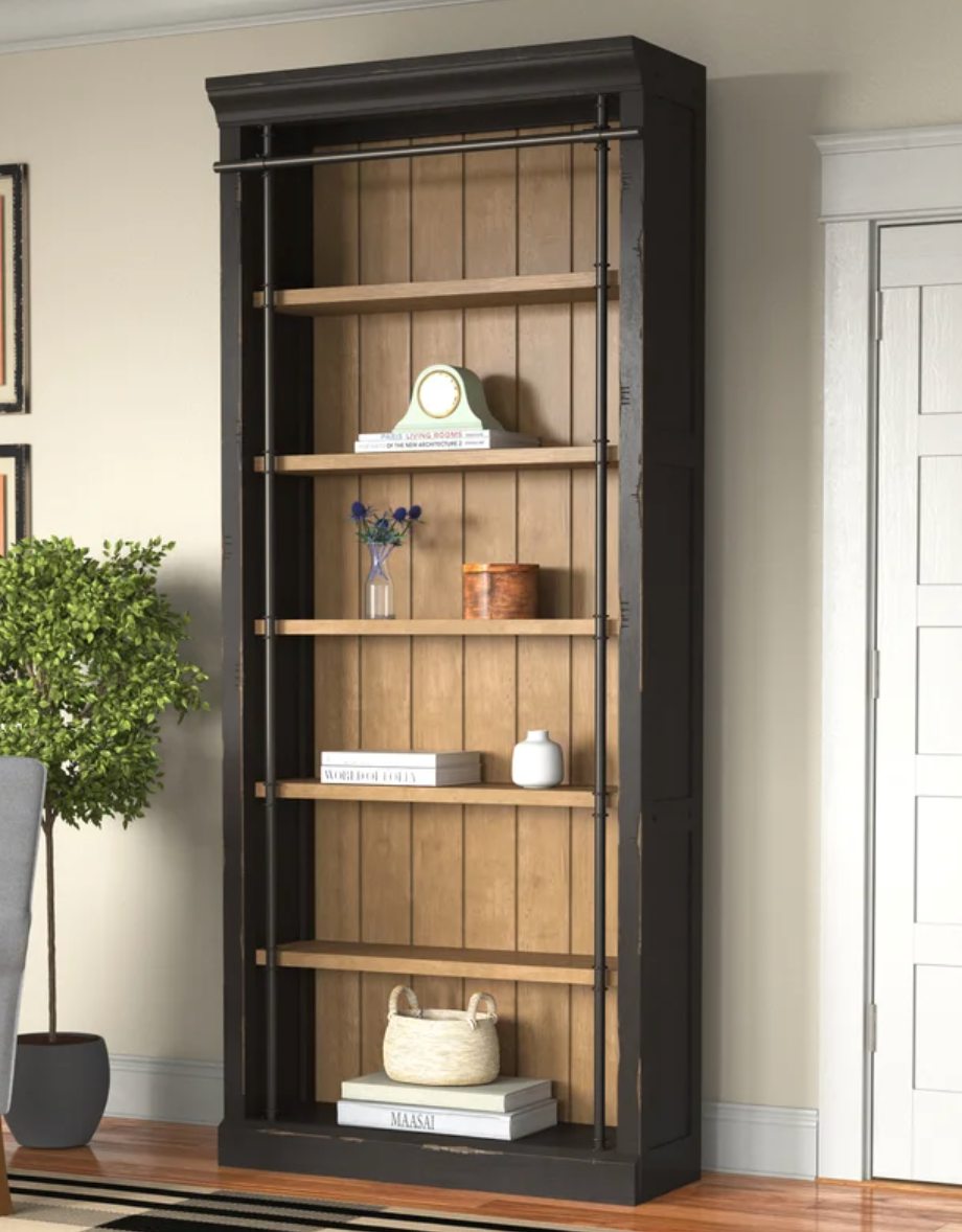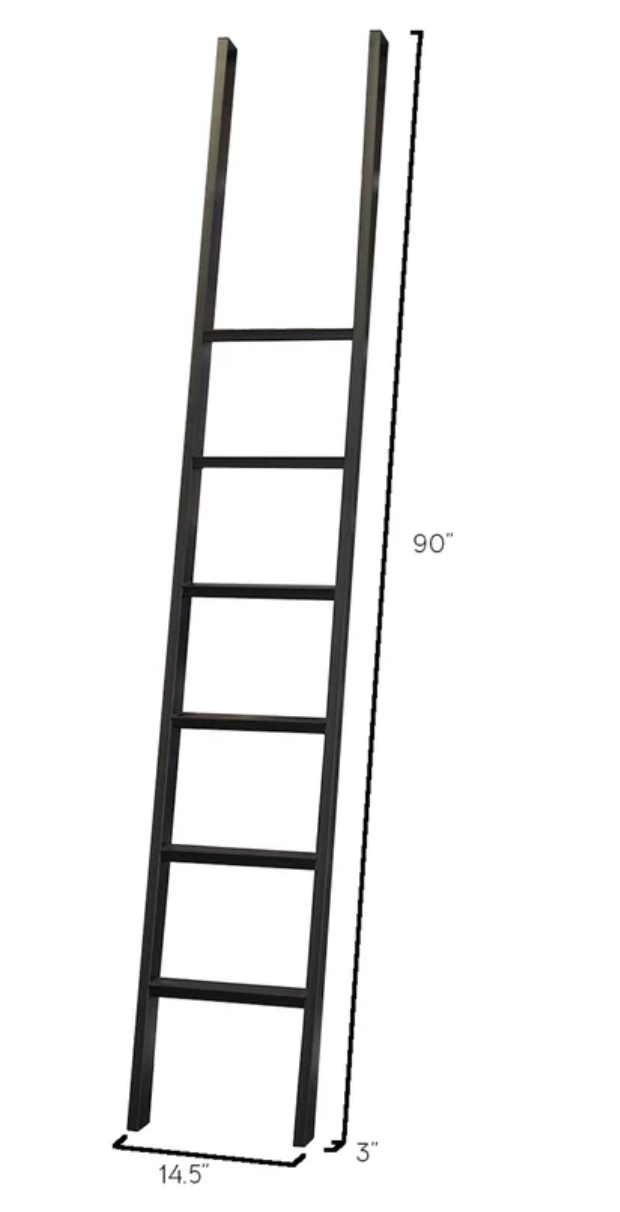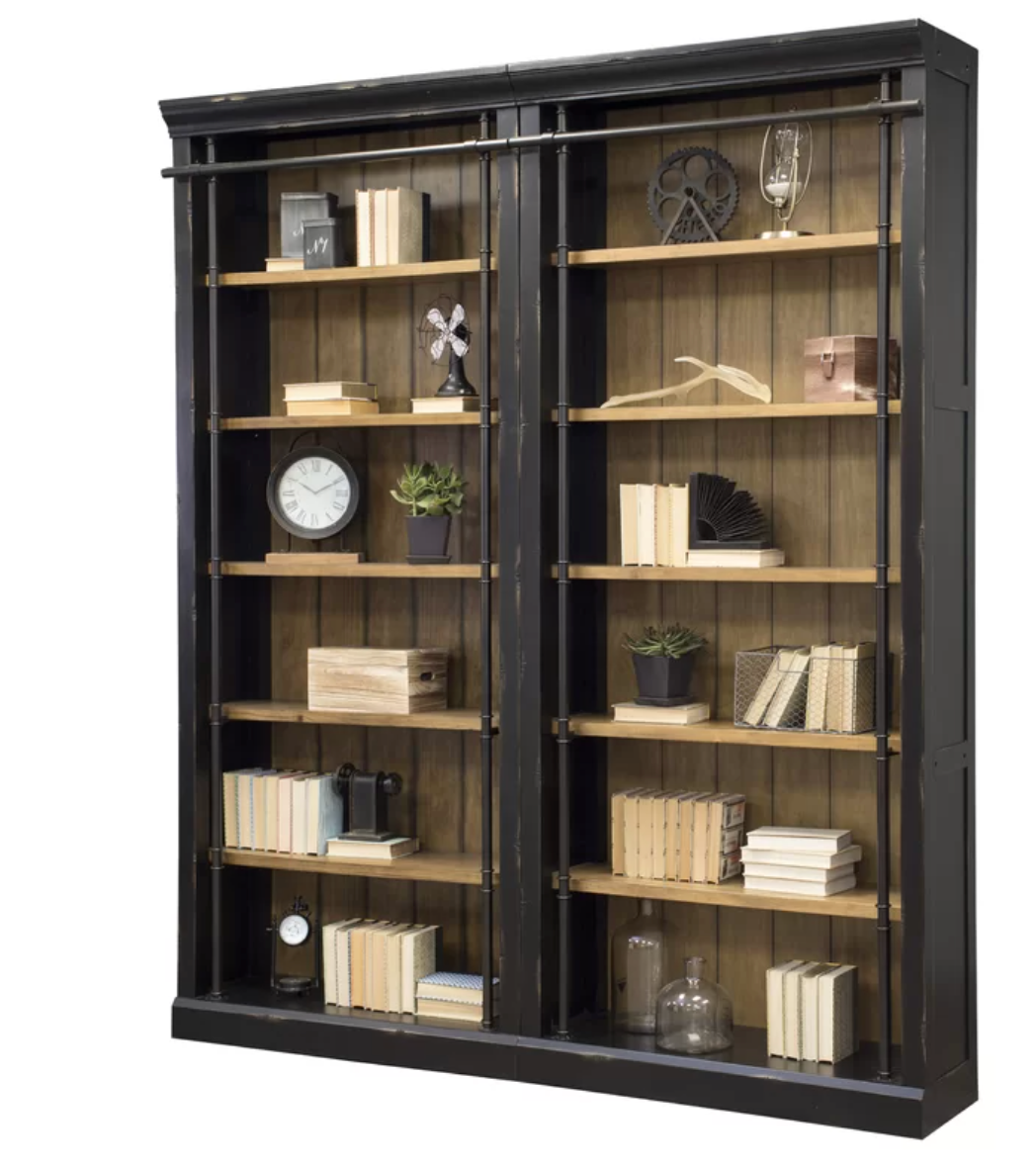 Classic Bookcases in Aged Black and Warm Honey finish, with steel rails and optional steel ladder. Use single piece, or in sets to create a wall of shelves