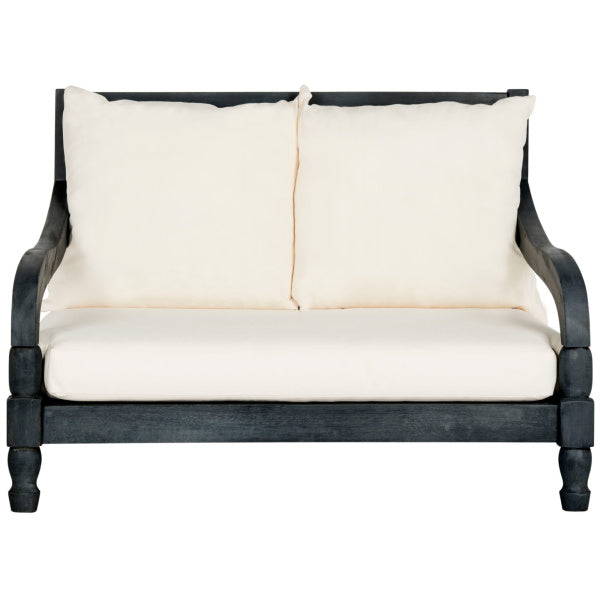 BLACK OUTDOOR LOVE SEAT LOUNGE CHAIR WITH WHITE CUSHIONS