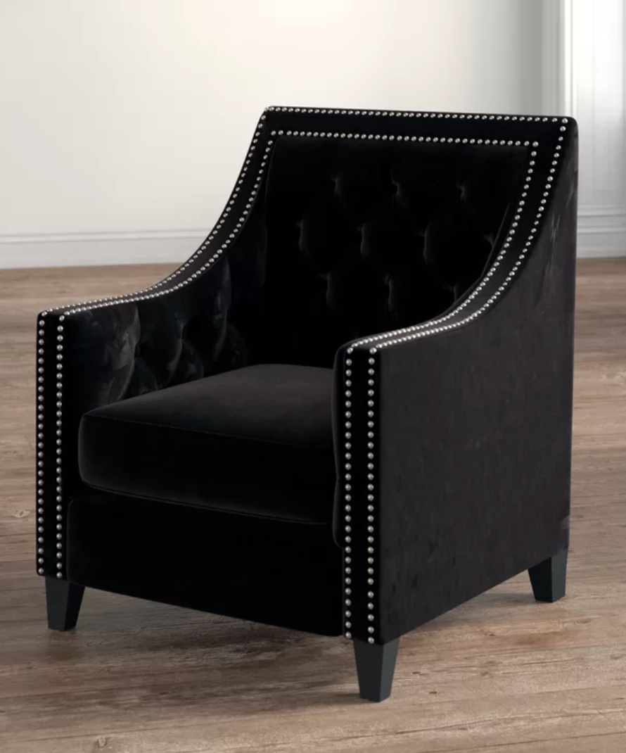 BLACK TUFTED VELVET ARM CHAIR WITH SILVER NAIL HEADS