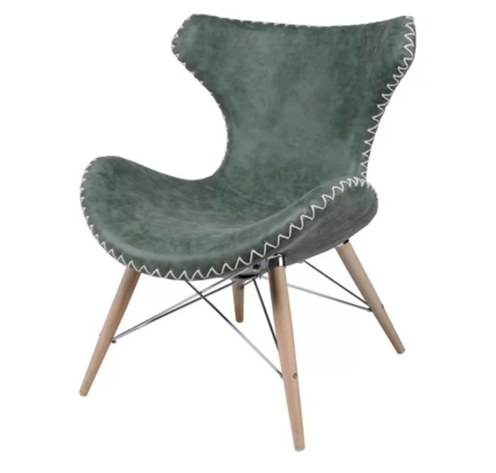 Antique green, faux leather mid-century modern style with a "stitch" of pure style. Natural wood legs with chrome metal accents.