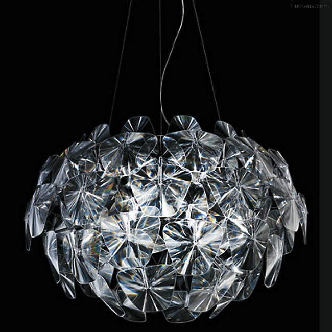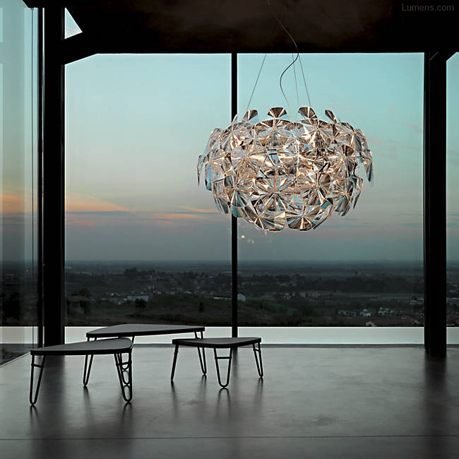 The Hope Suspension chandelier is made from a series of thin polycarbonate prismatic Fresnel lenses, which create a refractive effect similar to glass, but without the bulk and weight. Uses three 150watt(2600 lumens) 120 volt E26 medium base halogen bulbs