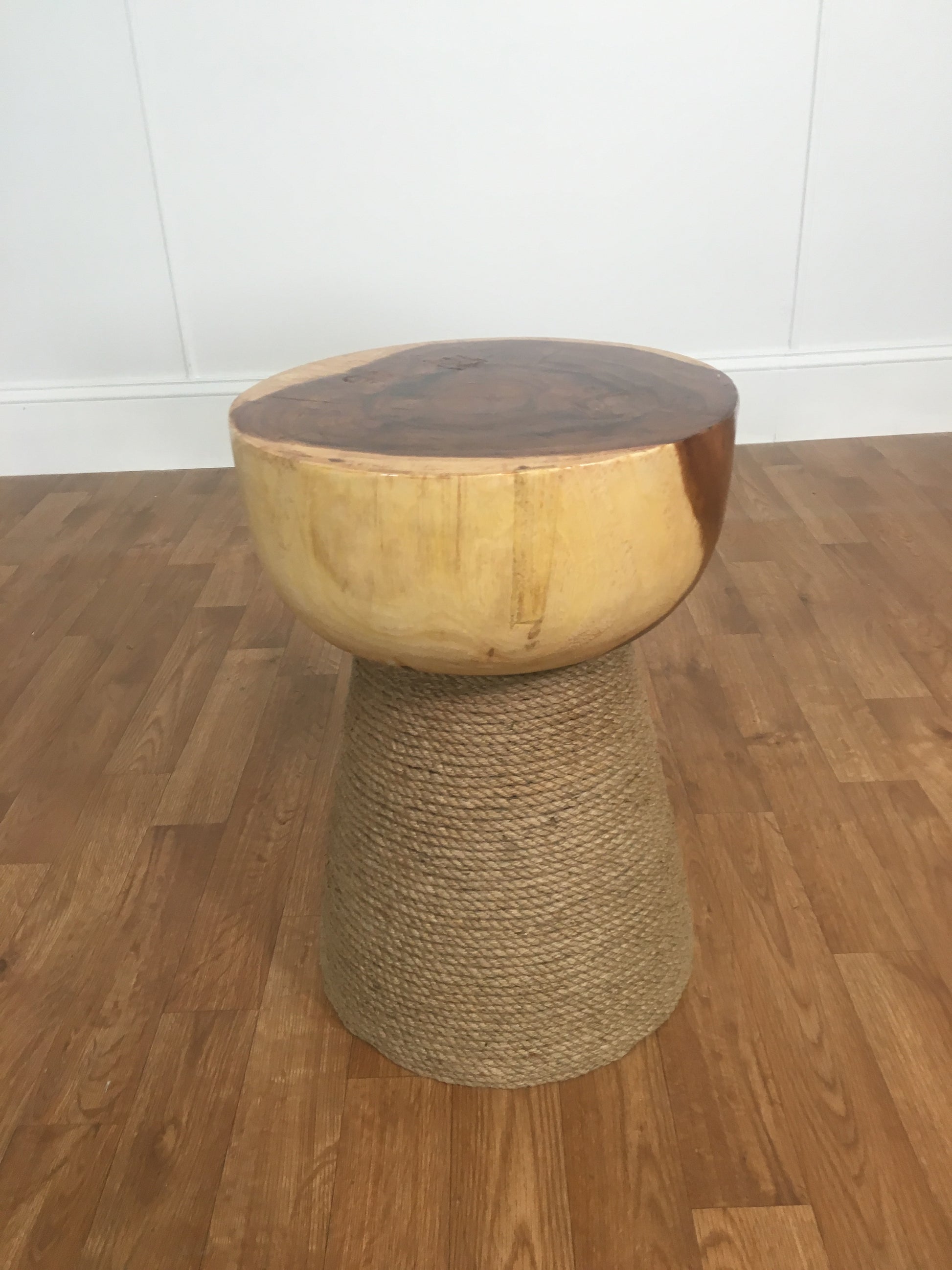 TWO-TONE WOOD HOURGLASS ACCENT TABLE WITH SISAL BASE