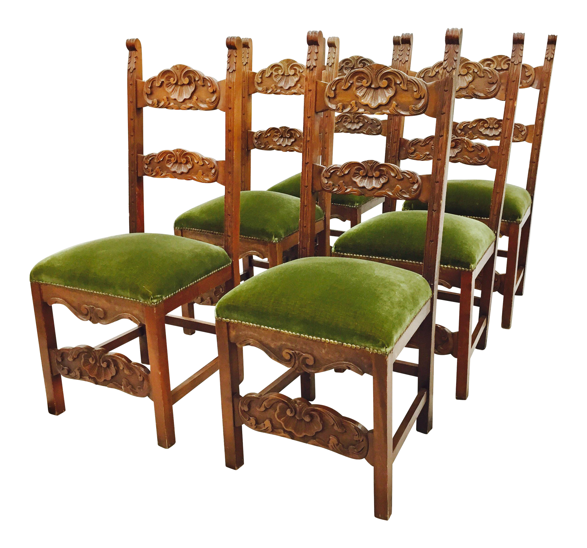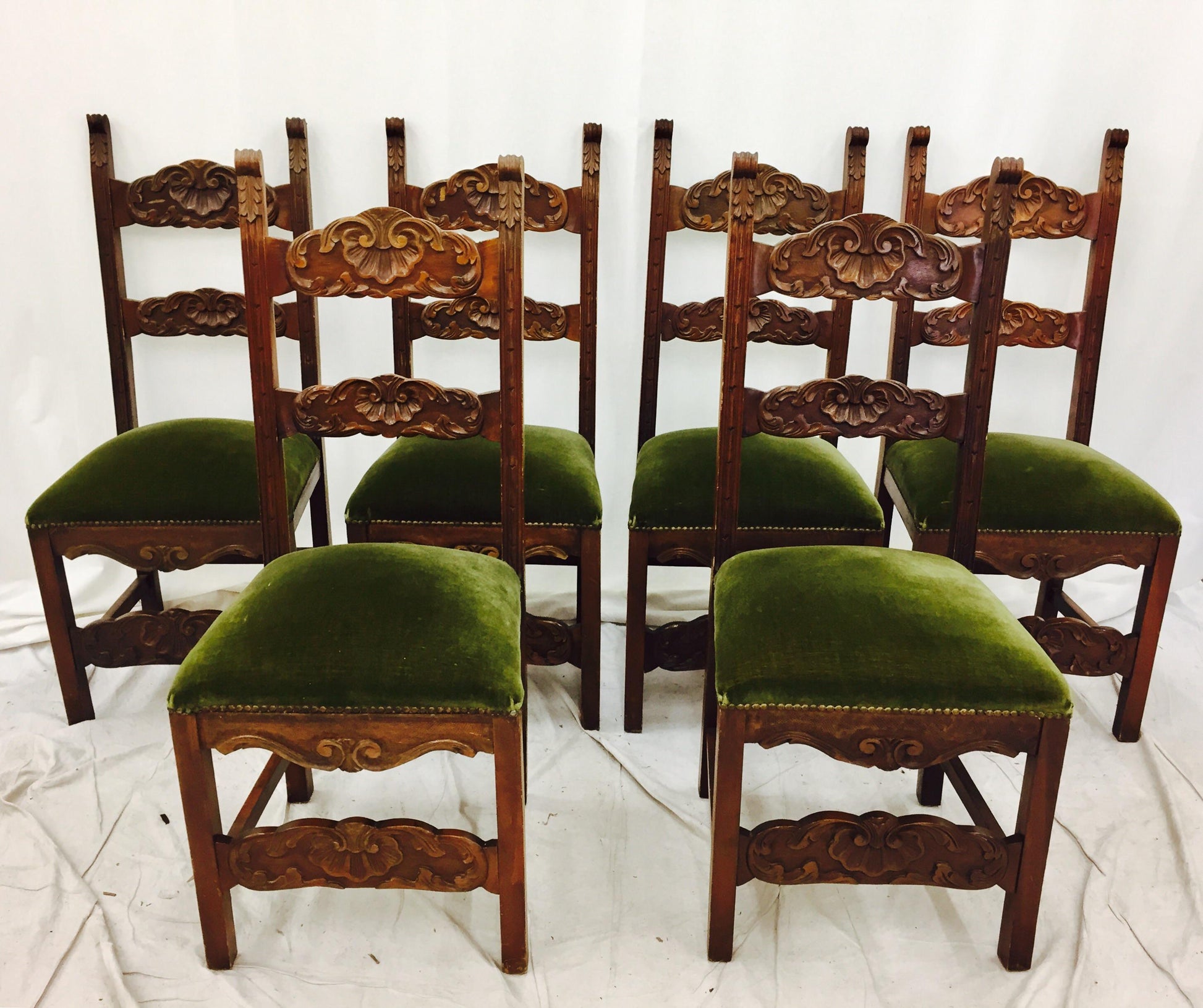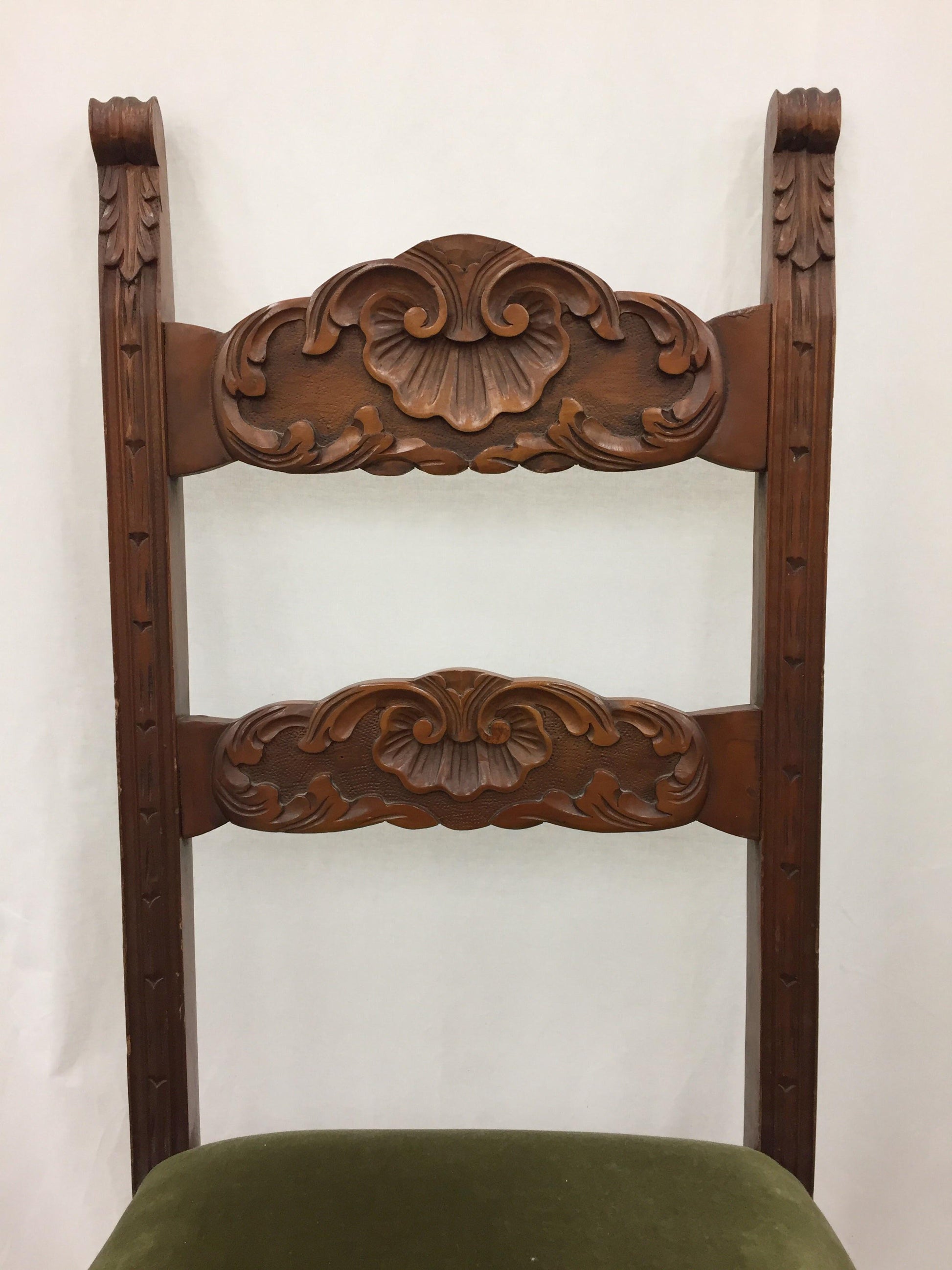 Beautiful set of vintage carved shell back wooden dining chairs with green velvet upholstered seats