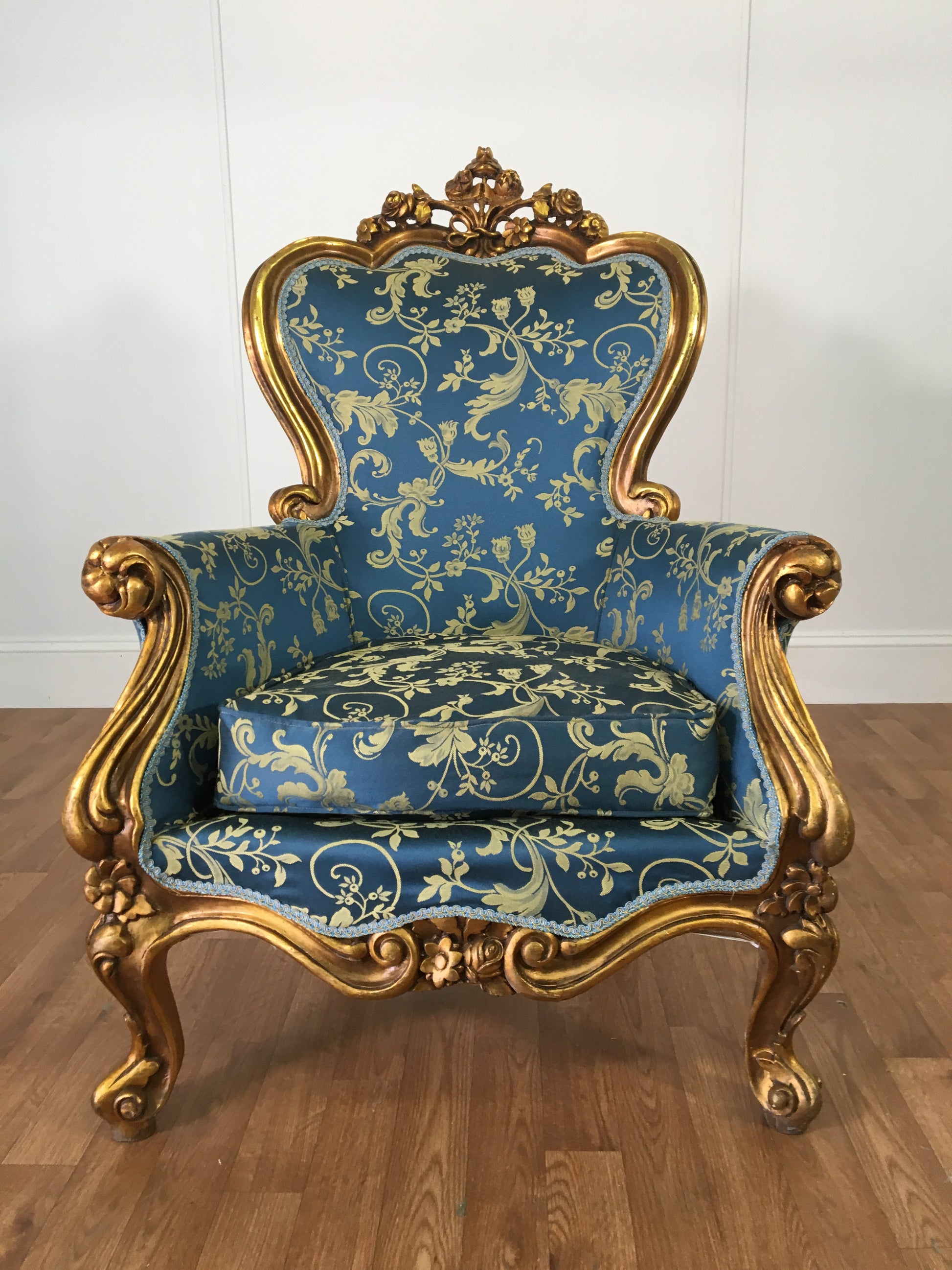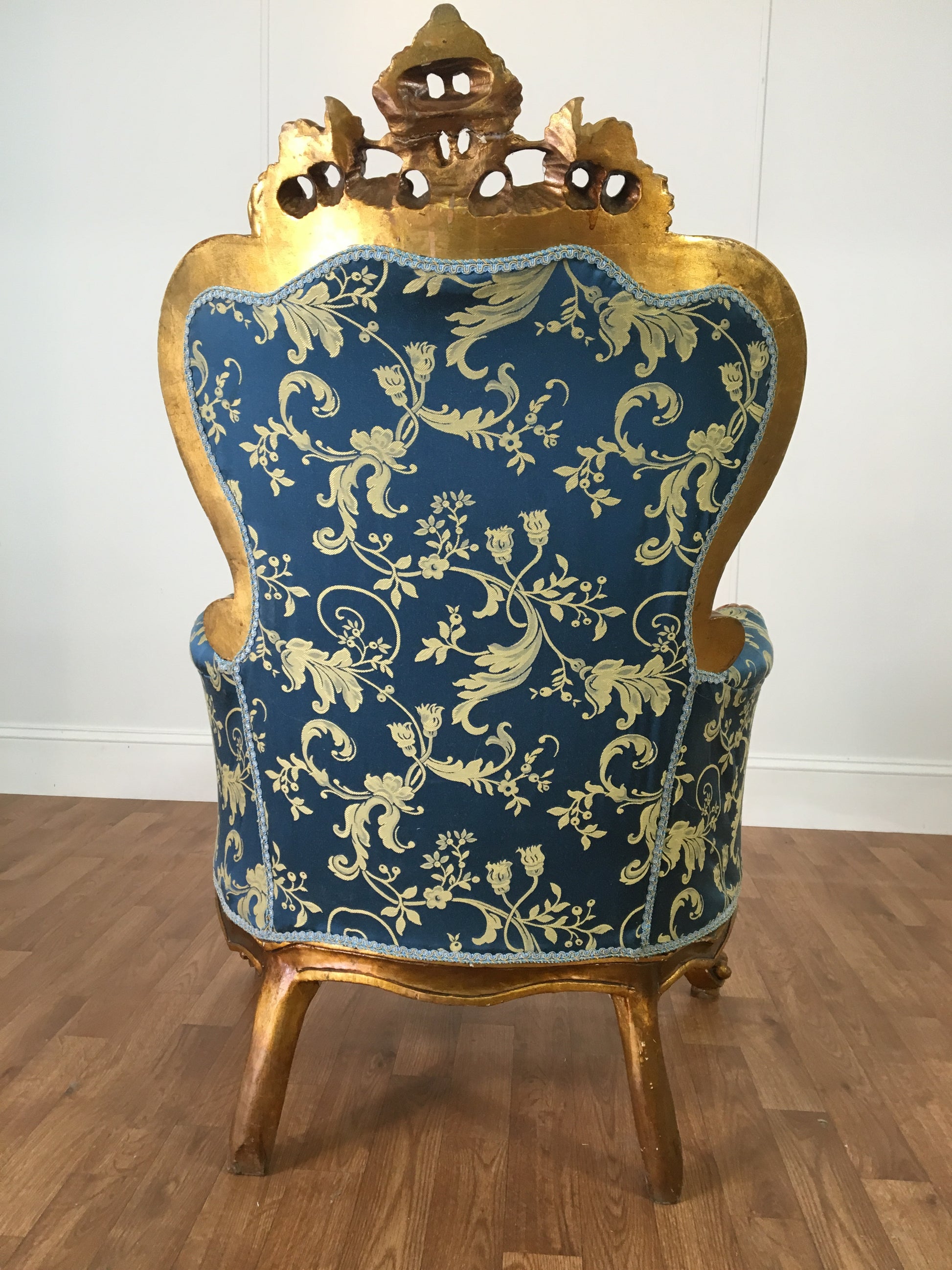 ORNATE VICTORIAN BLUE AND GOLD WINGBACK CHAIR