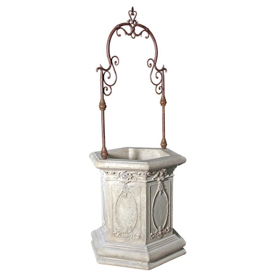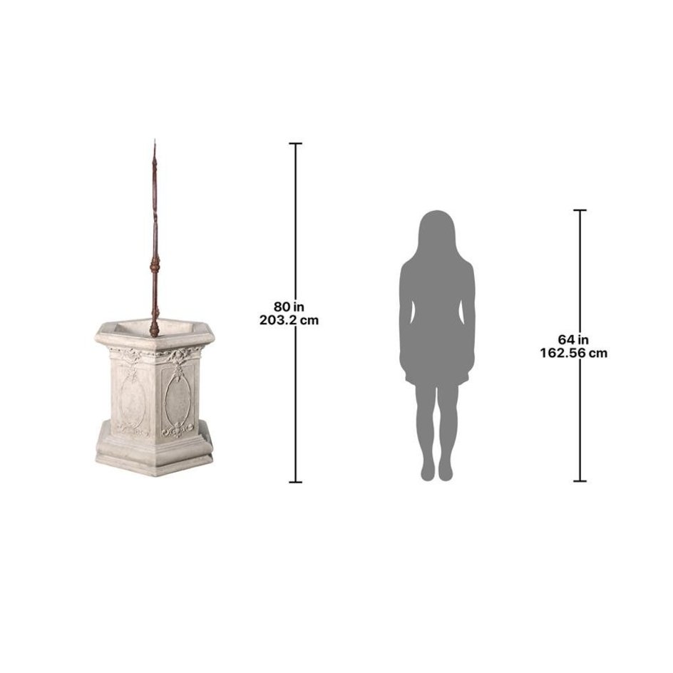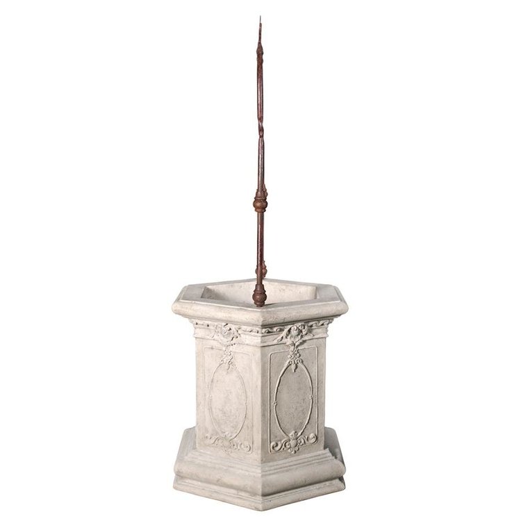 ornate black wrought iron with aged rust patina recalls a rich, centuries-old European tradition. The heavyweight hexagonal base is finely sculpted, then cast in quality designer resin with a durable, faux stone finish.